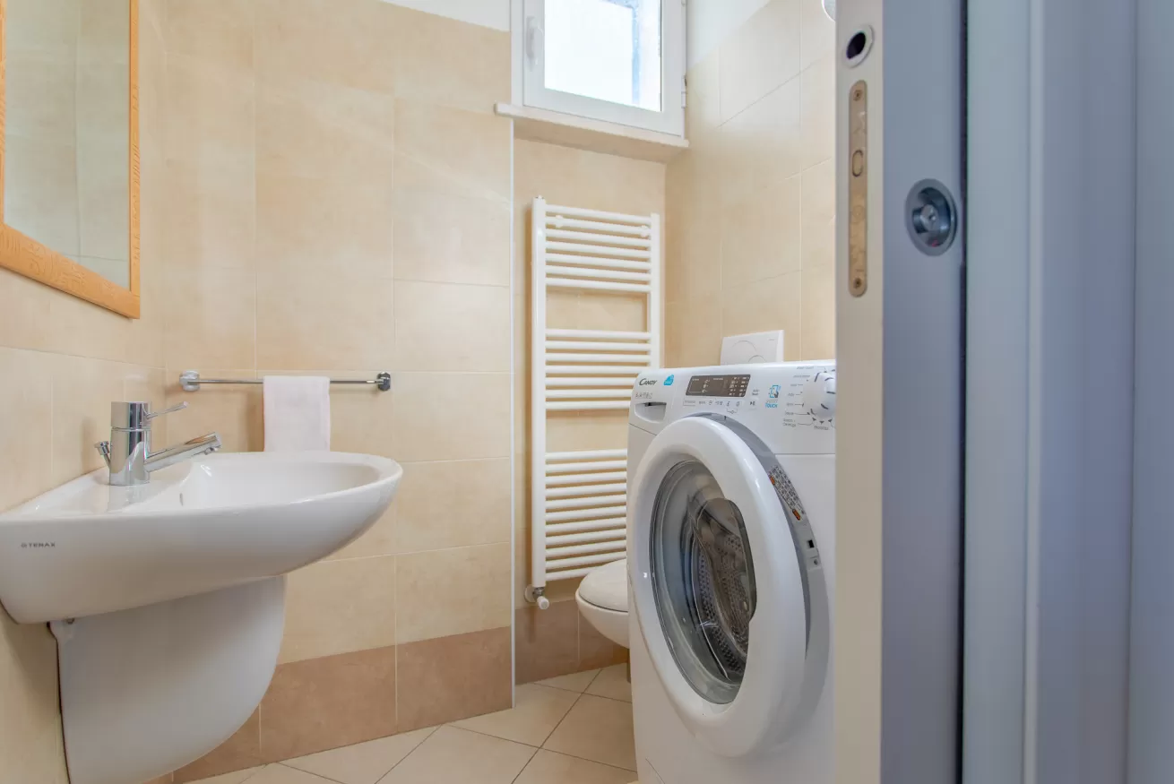 Comfort extra: Doppi servizi, lavatrice e posto auto privato interno sempre disponibile.