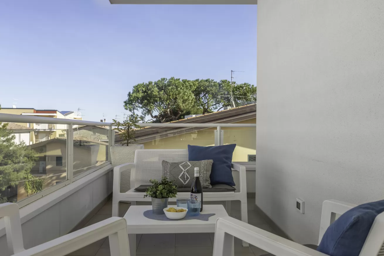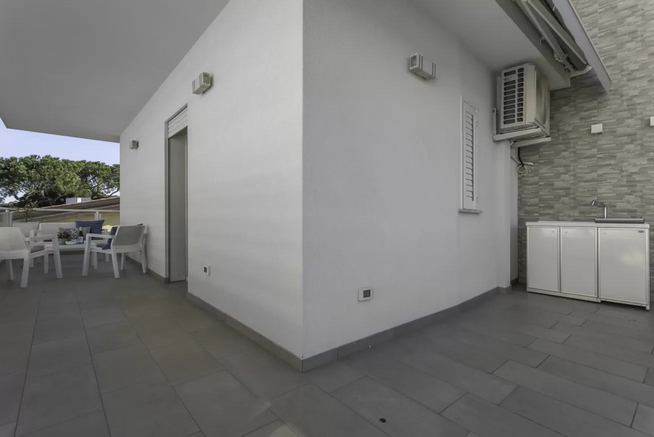 Gli ampi terrazzi, arredati con divani e sedie, offrono spazi ideali per momenti di relax e per pranzi all’aperto. A disposizione degli ospiti è inoltre presente un posto auto privato all’interno dello stabile.